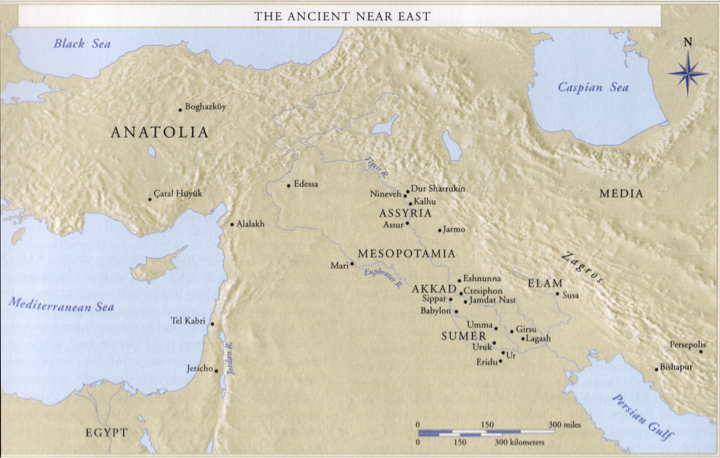 Thanks to thousands of inscribed clay and stone tablets like the one shown above, we know a lot about ancient Mesopotamia (Greek for the “land between the rivers”), with a level of detail and accuracy impossible for the Paleolithic and Neolithic periods. As humans began to settle in fixed locations during the Neolithic period, great changes came to the human experience when small communities became towns and cities, and cultural identities and common languages and belief systems led to what we would consider civilization.