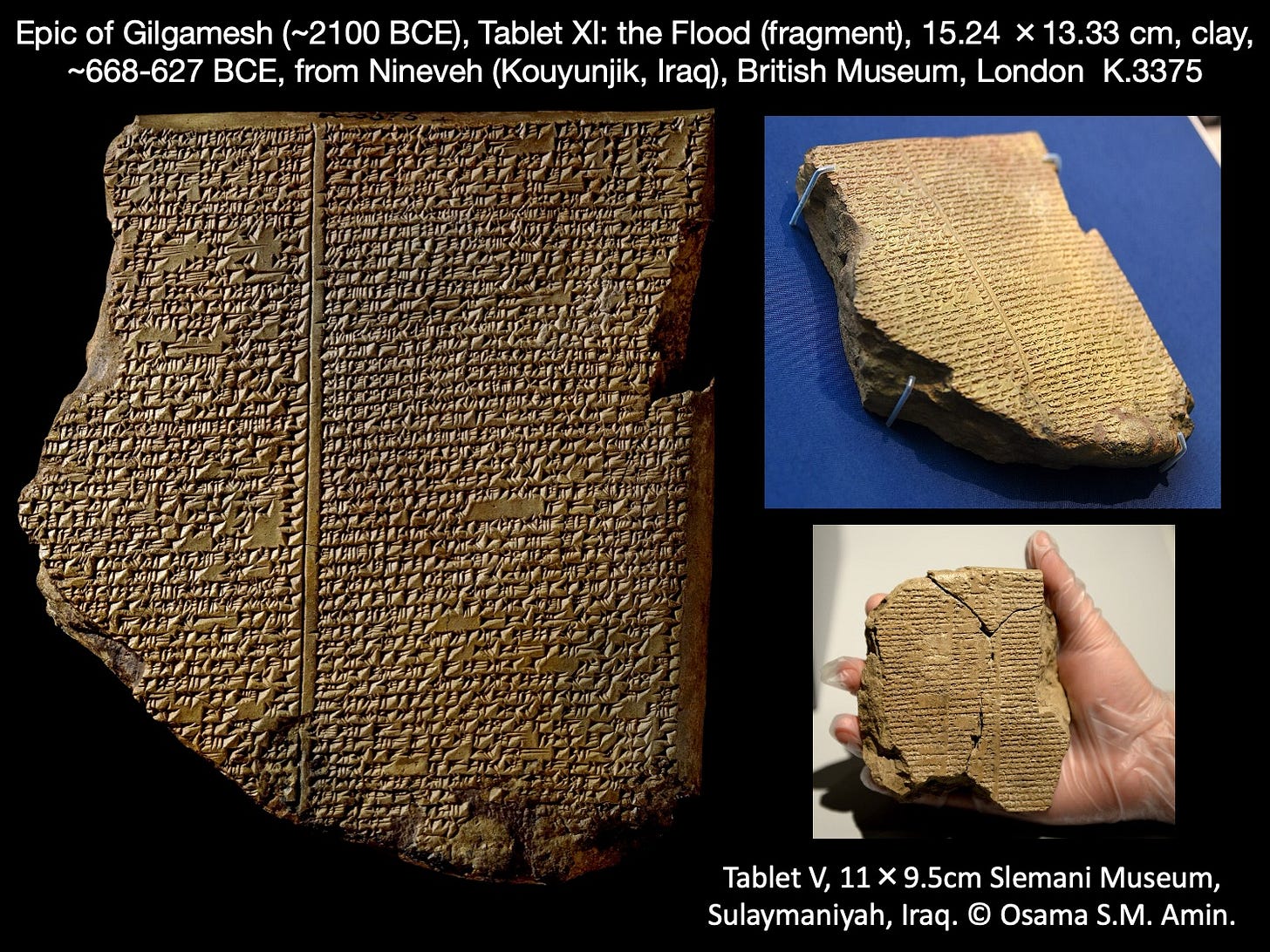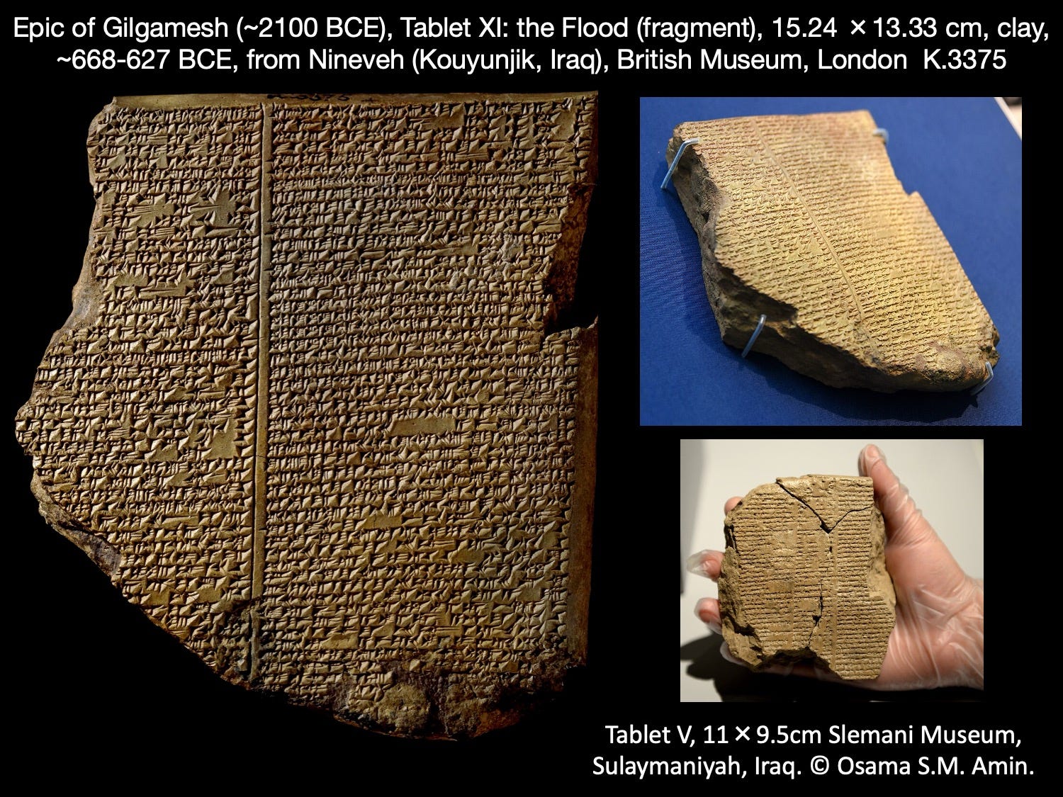 Though much of the poem has been known and understood since the 1870s through tablets kept at the British Museum (above left and upper right), a tablet with the story of the great flood discovered in Iraq was acquired, translated, and published by the Slemani Museum between 2011 and 2014 (above lower right). This discovery expanded the poem and has led to a richer understanding of the story that parallels the Biblical flood of Noah.2