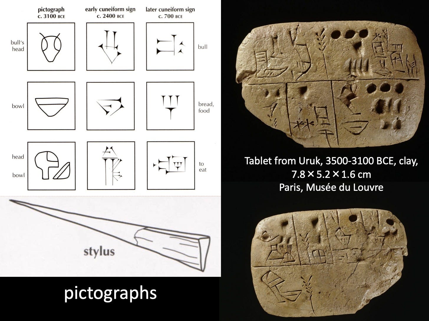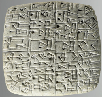 The earliest writings from Ancient Sumer used simplified symbols, or pictographs, that were etched with a sharp tool known as a stylus. Over time, these images were further abstracted into wedge shapes arranged into different configurations to signify words and concepts. The pictograph tablets, like the double-sided one from Uruk shown above, are separated into grid squares read in sequence from top to bottom and often from right to left. This particular tablet records quantities of food, specifically barley rations, with numeration represented by the hole-like indentations. We can use the chart at the left to find the bowl in the lower right of the upper view, signifying food, while the pictograph for eating is seen on the lower left of the opposite side.