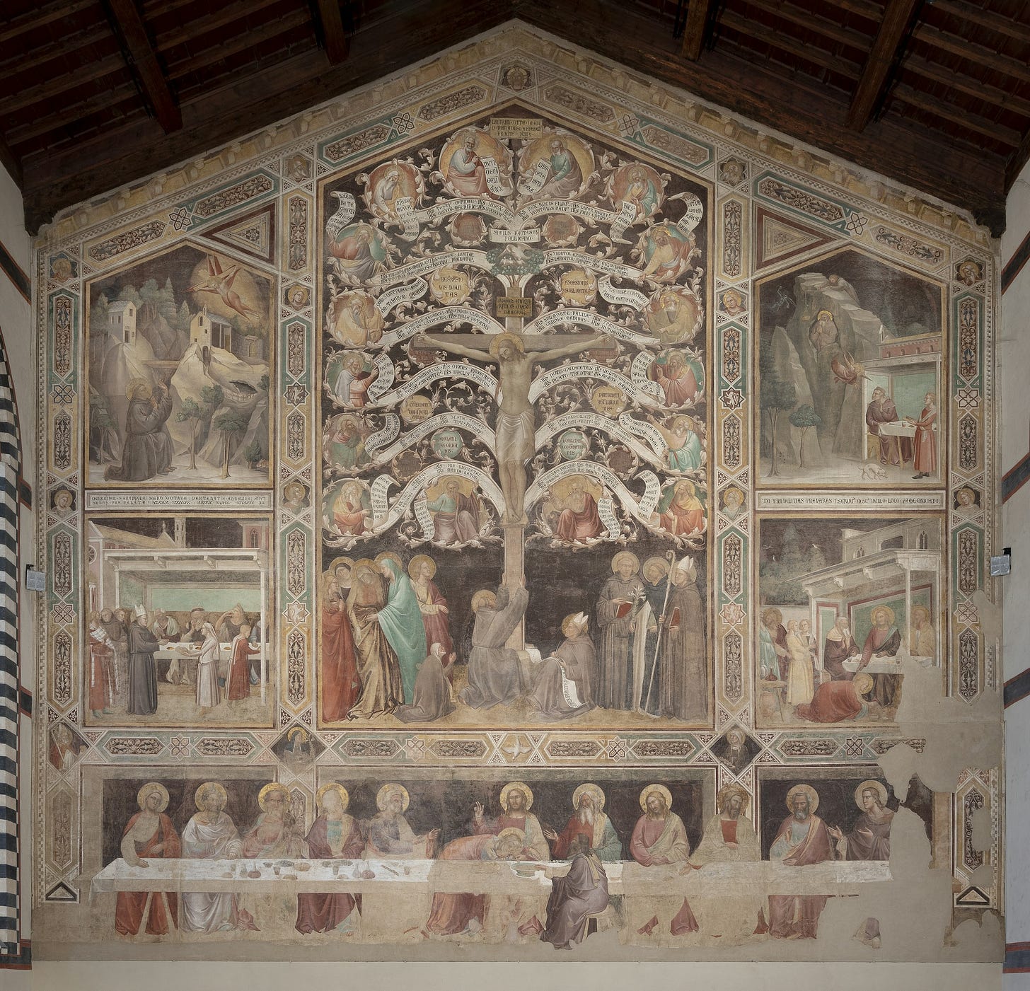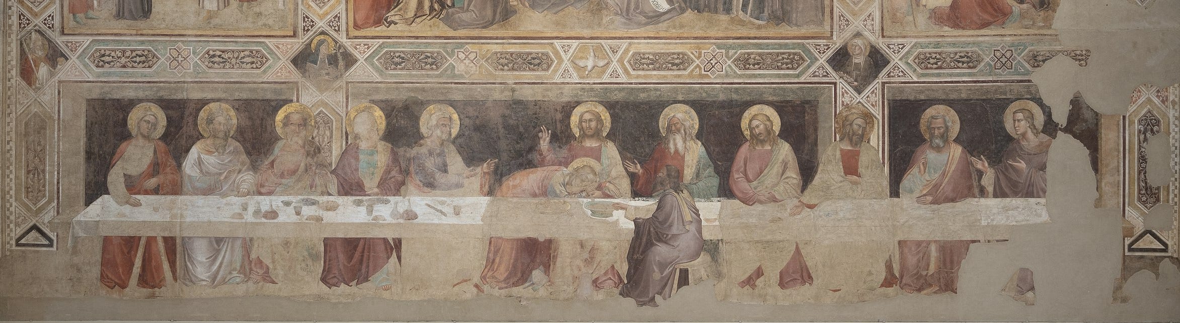 Gaddi’s Last Supper is part of a mural that fills the entire end wall of the refectory at Santa Croce. It is the lowest portion of a complex image in which Gaddi surmounted the Last Supper with a scene of the Crucifixion and framed by the Stigmatization of St. Francis and three other narratives associated with food, in keeping with the room’s function as a dining room. Beneath the fresco, the friars ate in silence, encouraged to meditate, feeding their souls as they fed their bodies. Branches of the Tree of Life spring from the cross that holds Jesus’ body and receives Francis’ embrace. Other important Franciscans, as well as Saint Dominic, stand under the cross, indicating the important role these friar-preachers had in spreading the good news of the Gospel. For more, visit the website of Santa Croce Opera.