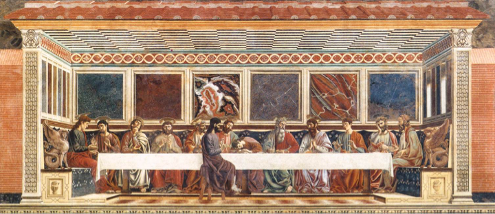 How does an artist represent a table scene with thirteen figures? The traditional response is well represented by The Last Supper painted in 1447 by Andrea del Castagno (ca. 1421–1457) for the dining room, or refectory, in the convent of Sant’Apollonia in Florence.