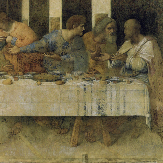 Leo Steinberg published a fascinating study of Leonardo’s mural in 2001, Leonardo’s Incessant Last Supper. His reading of the composition suggests that we are not only seeing the moment of shock and dismay at Jesus’ announcement, but that we are also witnessing Jesus prepare to make his covenant through bread and wine. At the end of his red sleeve, Jesus extends his right hand, which he has just removed from the dish shared with Judas, and reaches for a glass of red wine, the symbol of his blood shed for mankind’s sins. As Luke tells us:4