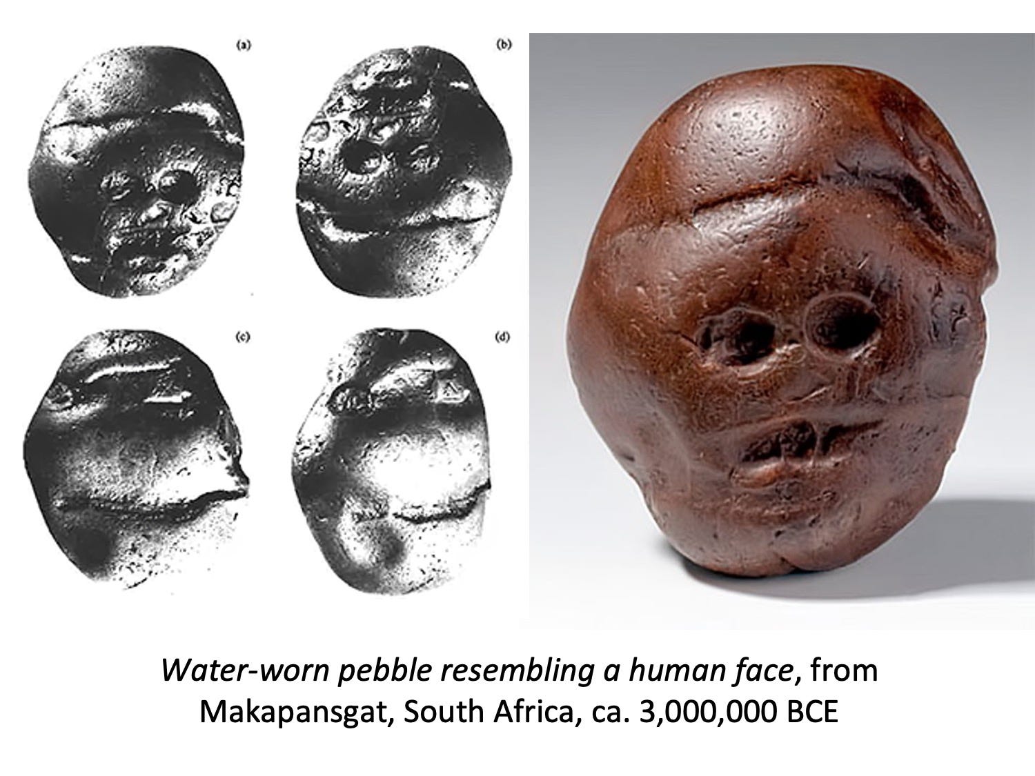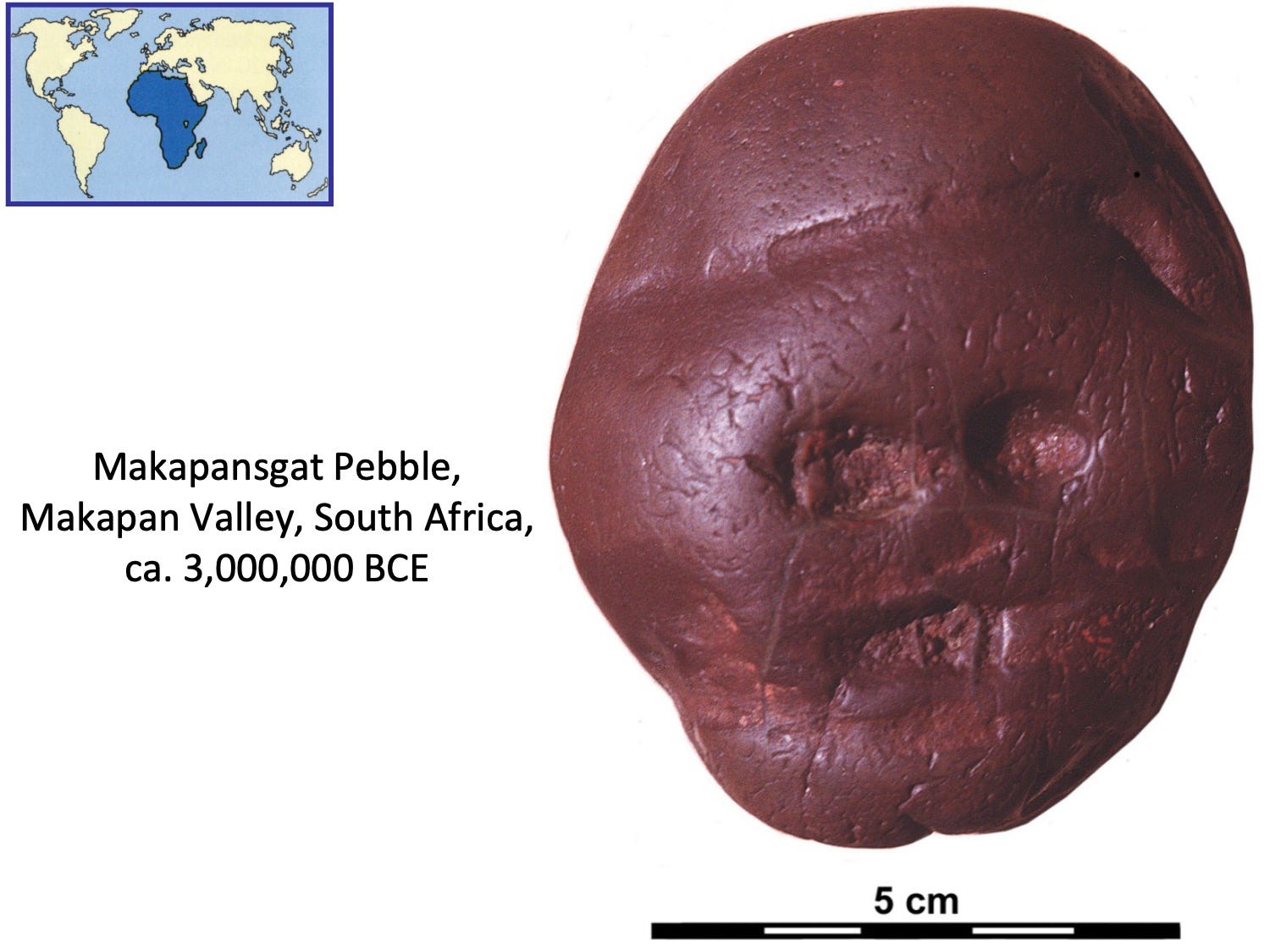 While many questions remain about this pebble and how it found its way from its natural source at least twenty miles from its findspot in the Makapansgat cave, we can feel comfortable concluding that a very early hominid had an aesthetic interest and aesthetic sense. While not the same as art making, the pebble shows early evidence of the recognition of images in the natural environment. We will have to wait at least 2½ million years before we find evidence of artistic production or creation.