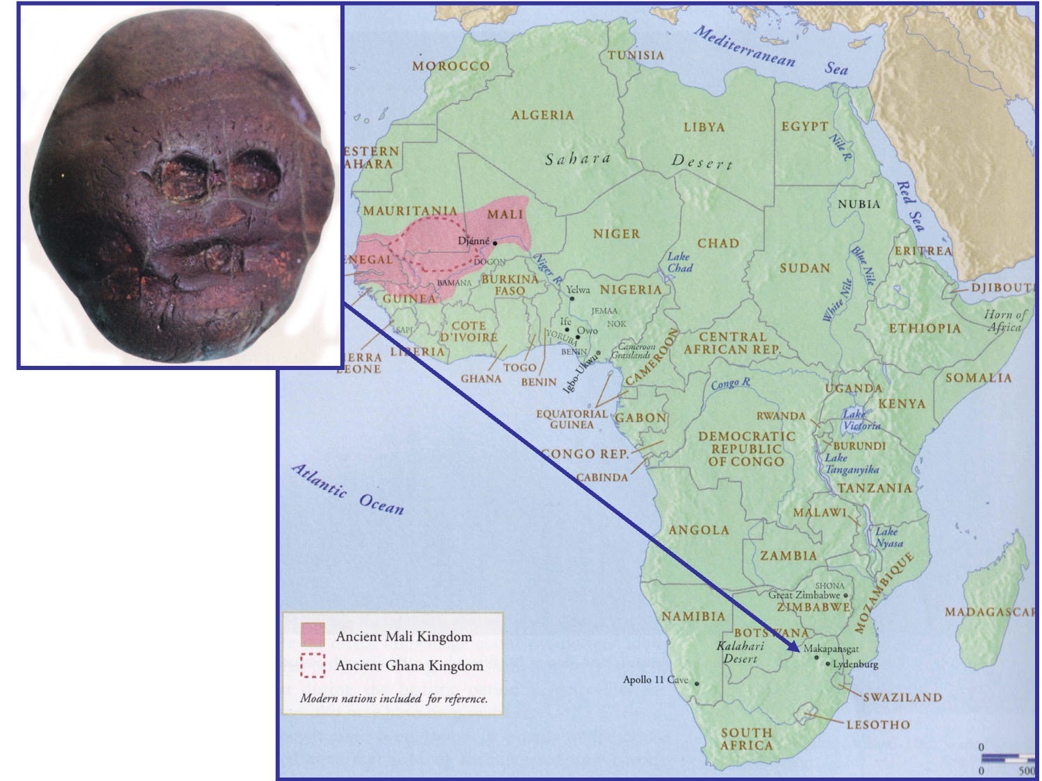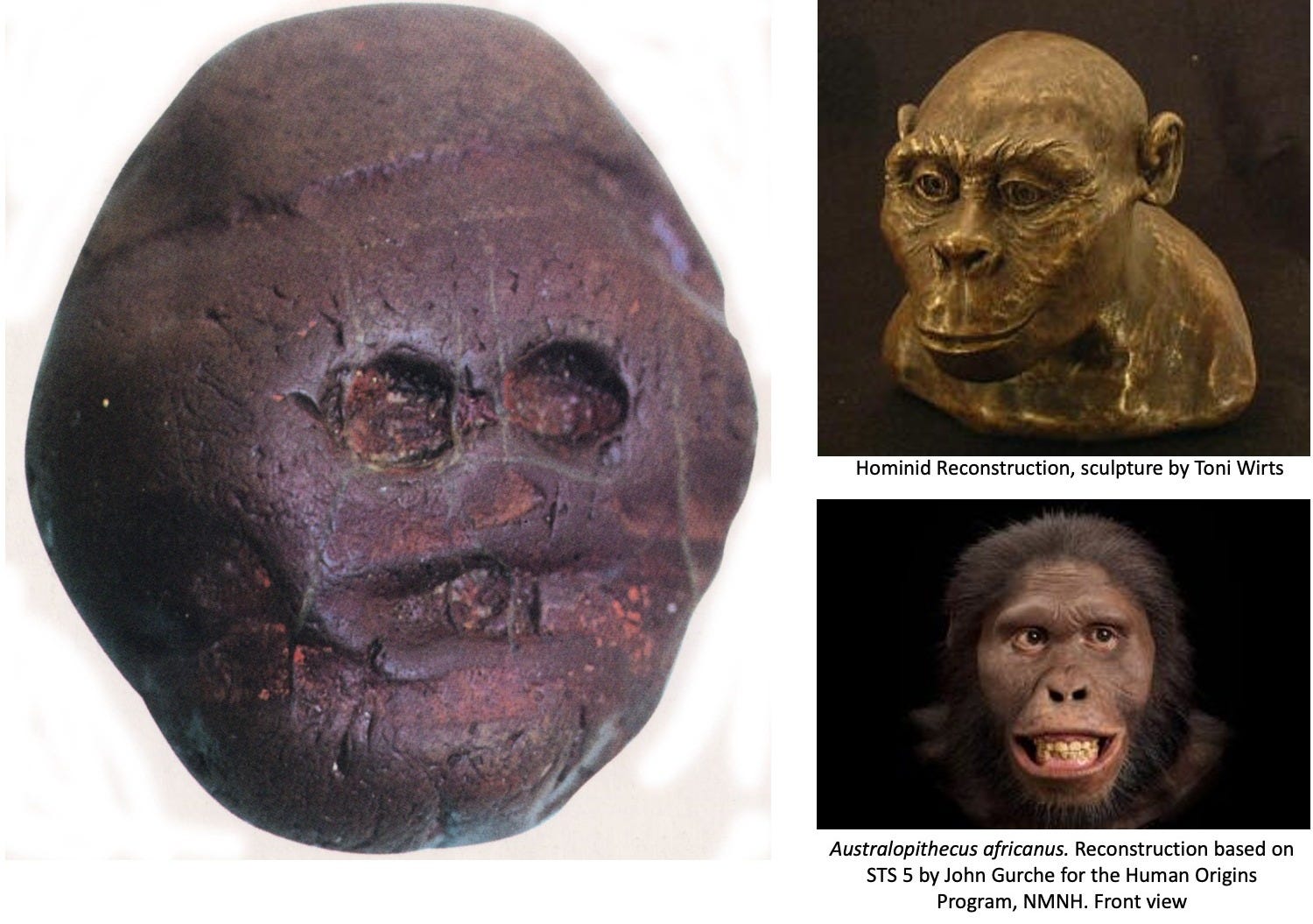 Our pebble-owner would have walked upright, had teeth similar to humans, but a much smaller brain. Archaeologists have surmised that the ridges and pockmarks on the surface of the Makapansgat pebble echoed our ancient ancestor’s face. He (or she) recognized the abstracted face and felt the stone was worth keeping. We call this type of object a “manuport” because it was picked up by a manus, or hand, and carried (portare) somewhere else.